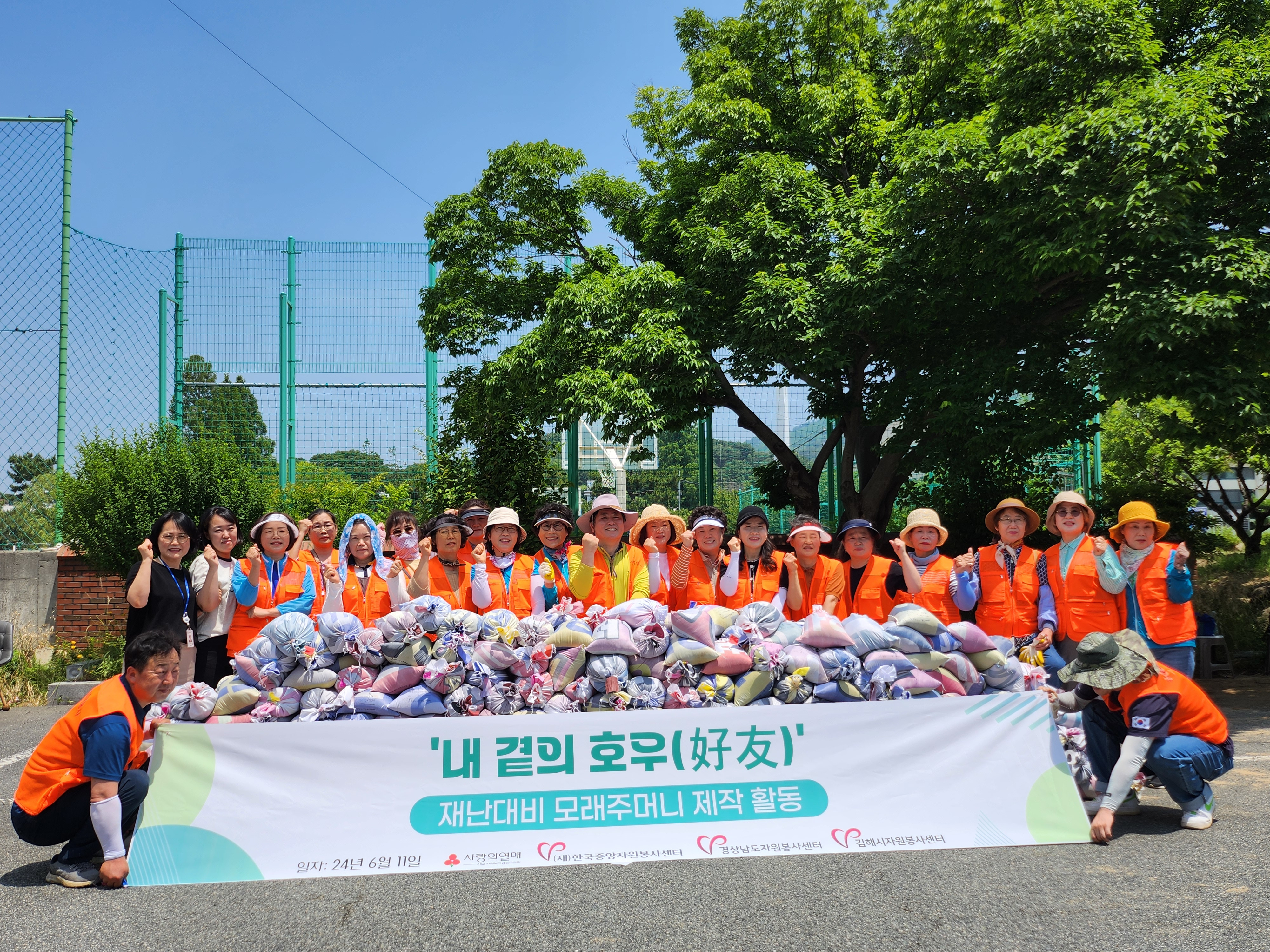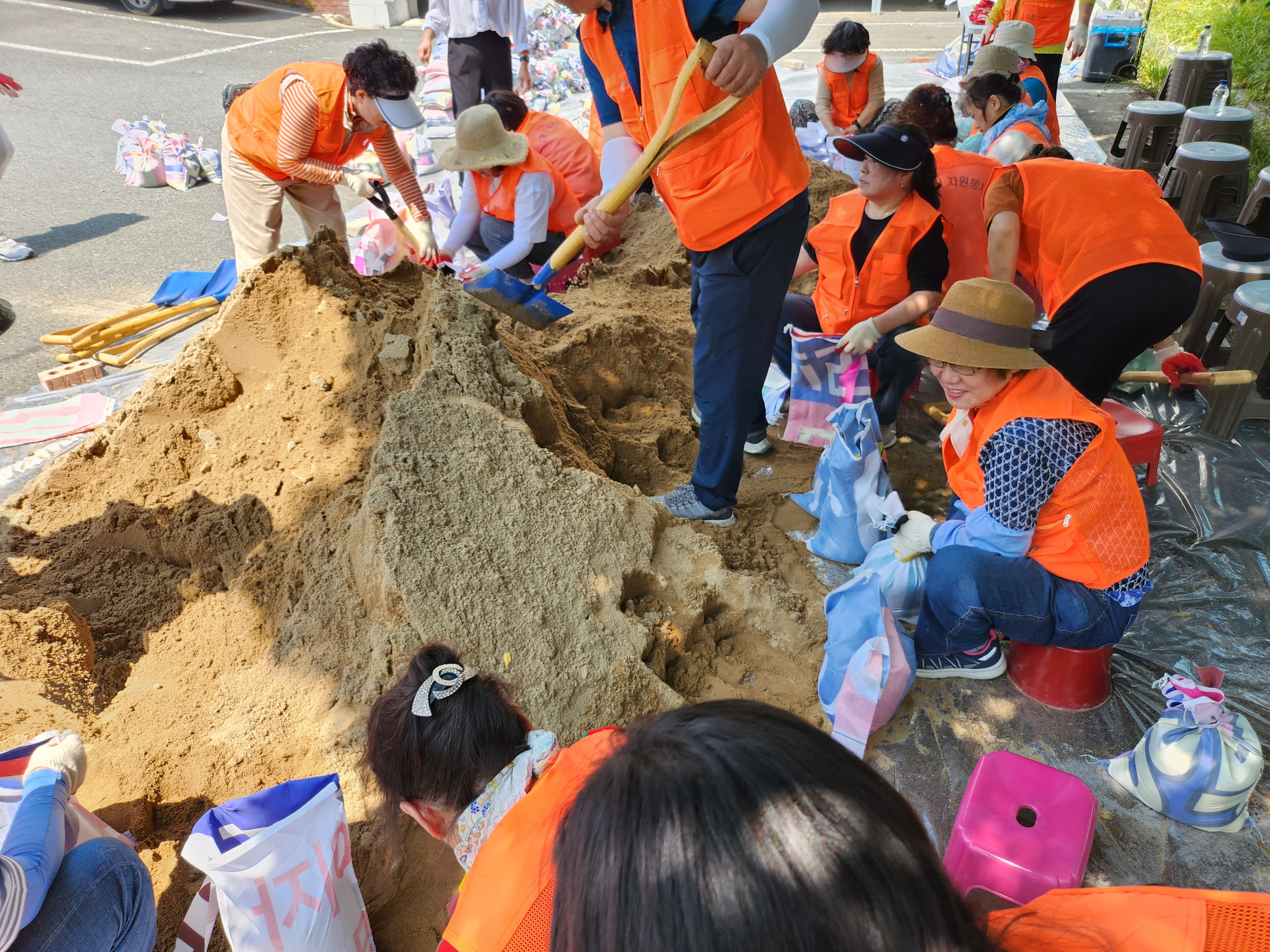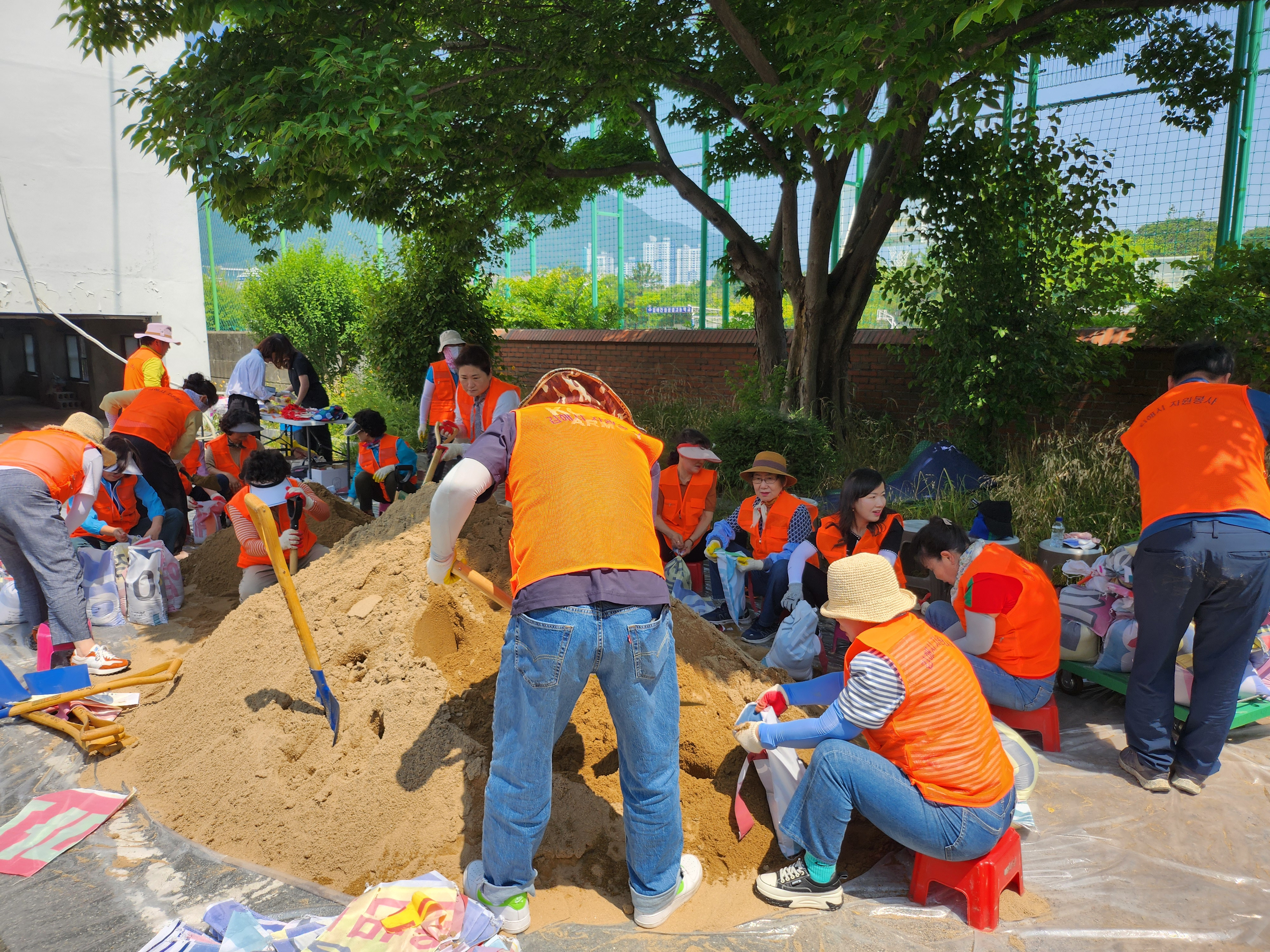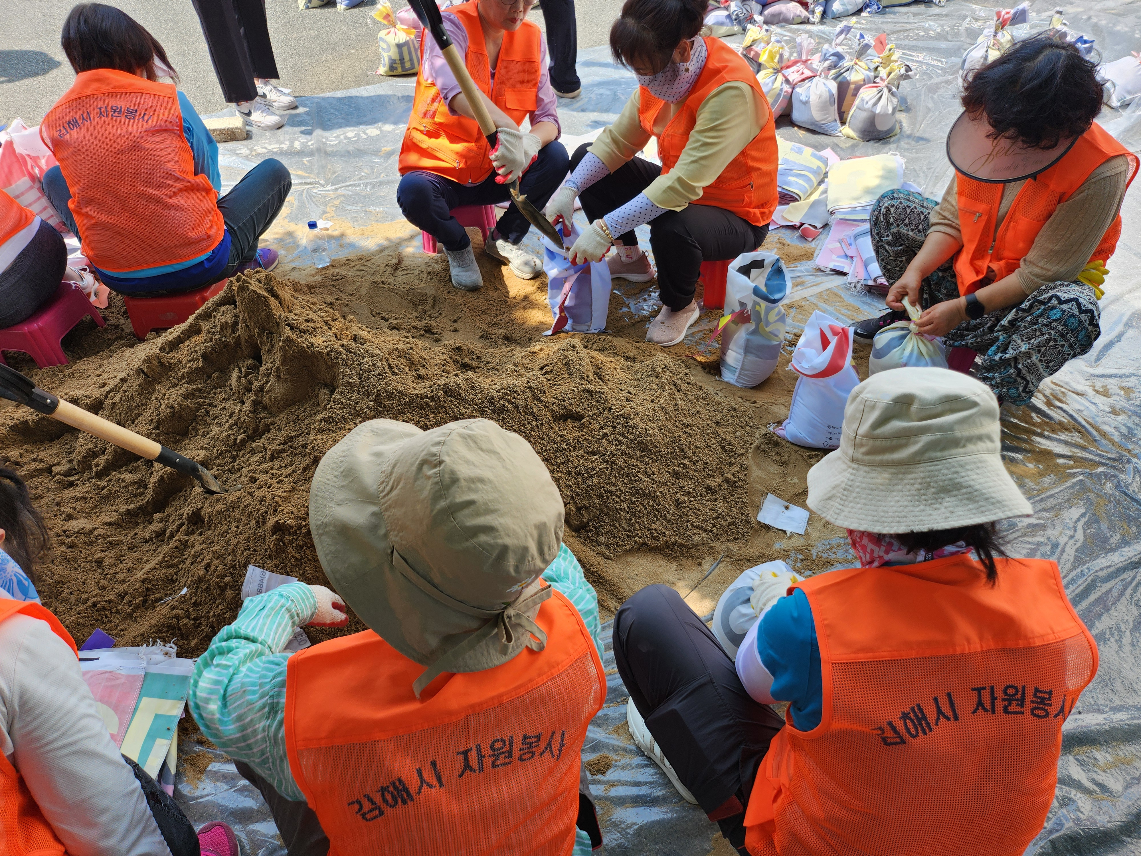 주말 동안 보슬비가 내린 후. 다소 햇빛이 강했던 6월 11일. 경상남도자원봉사센터와 김해시자원봉사센터가 함께 재난대비용 모래주머니를 만들었습니다.