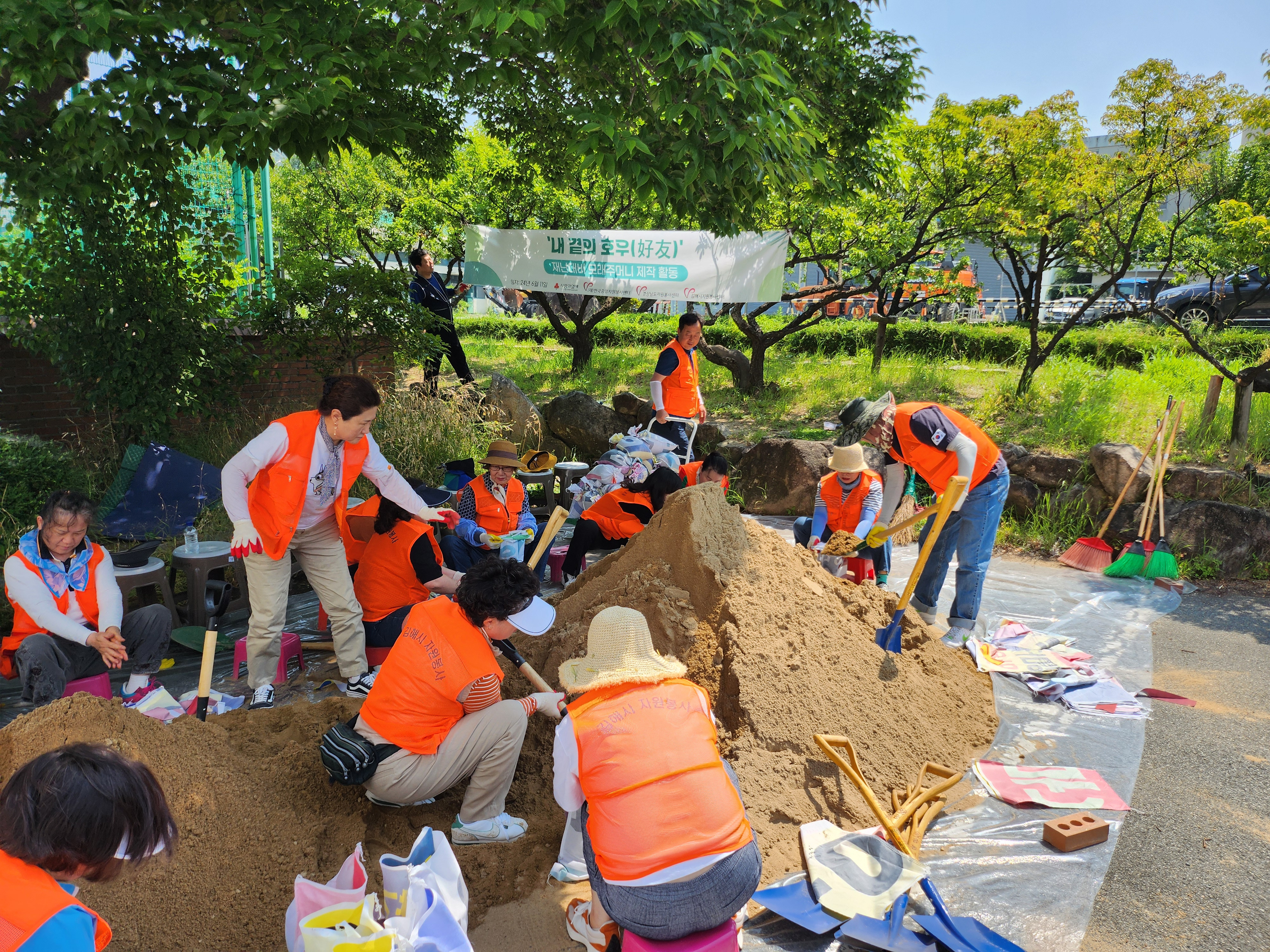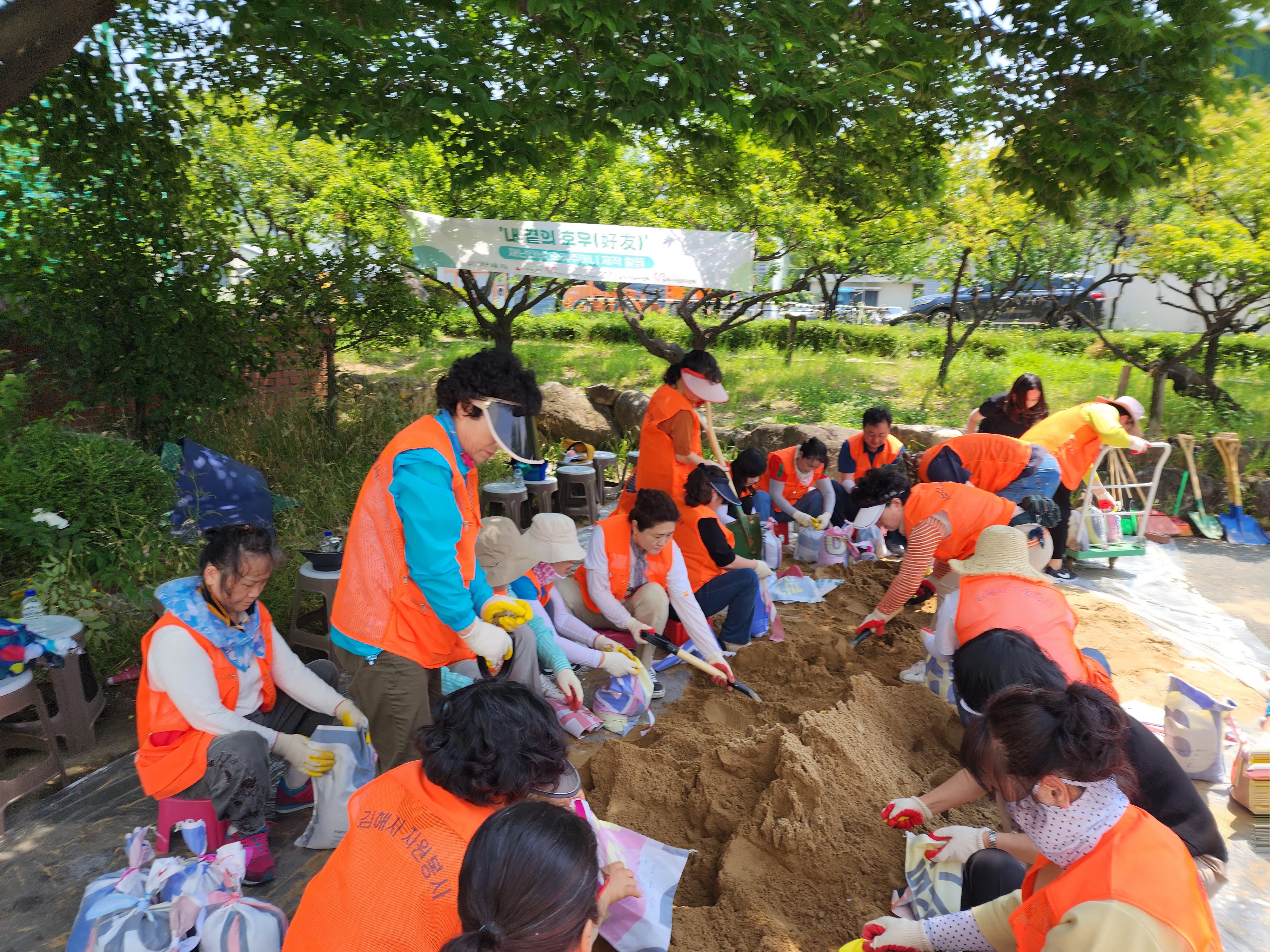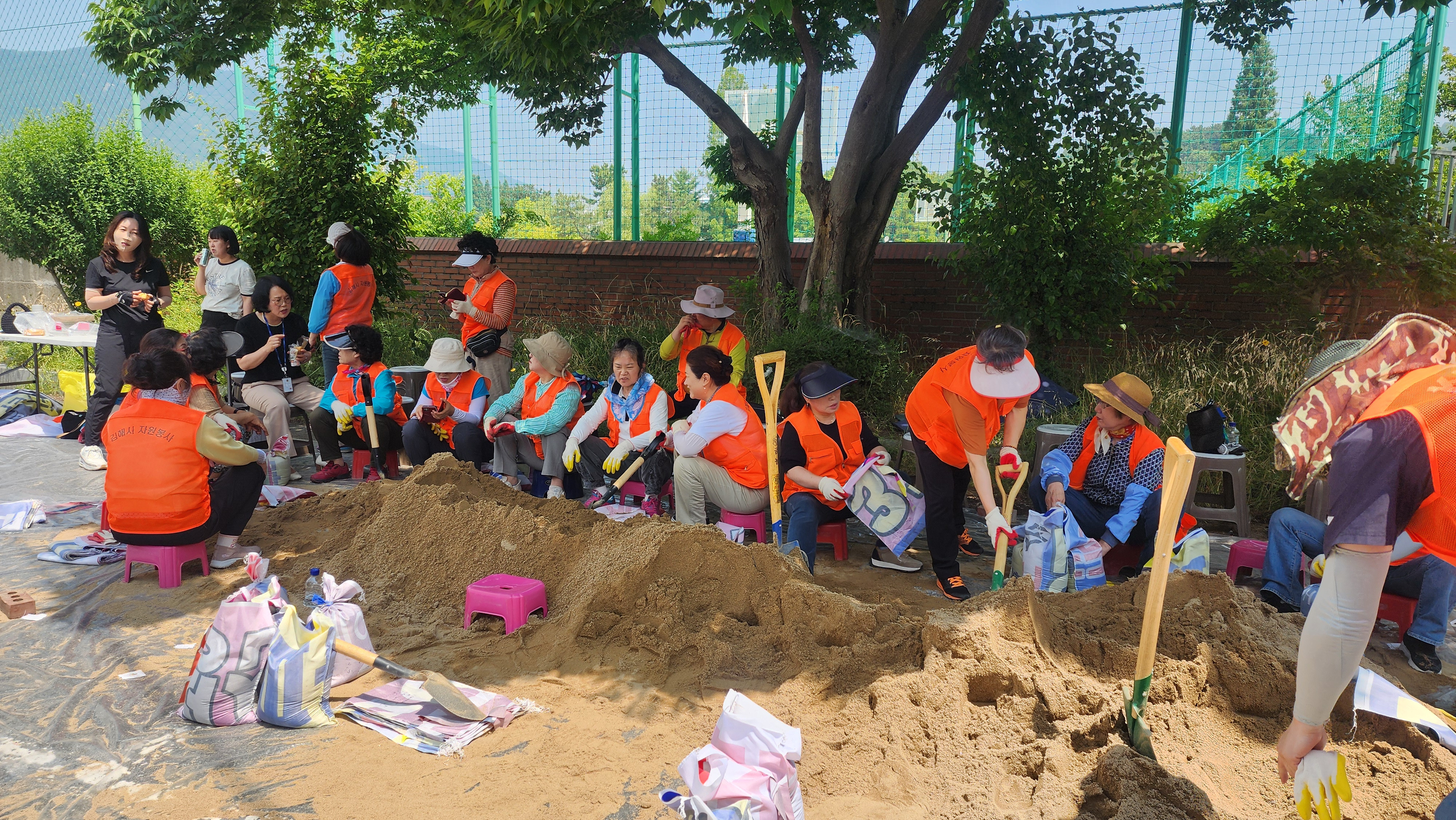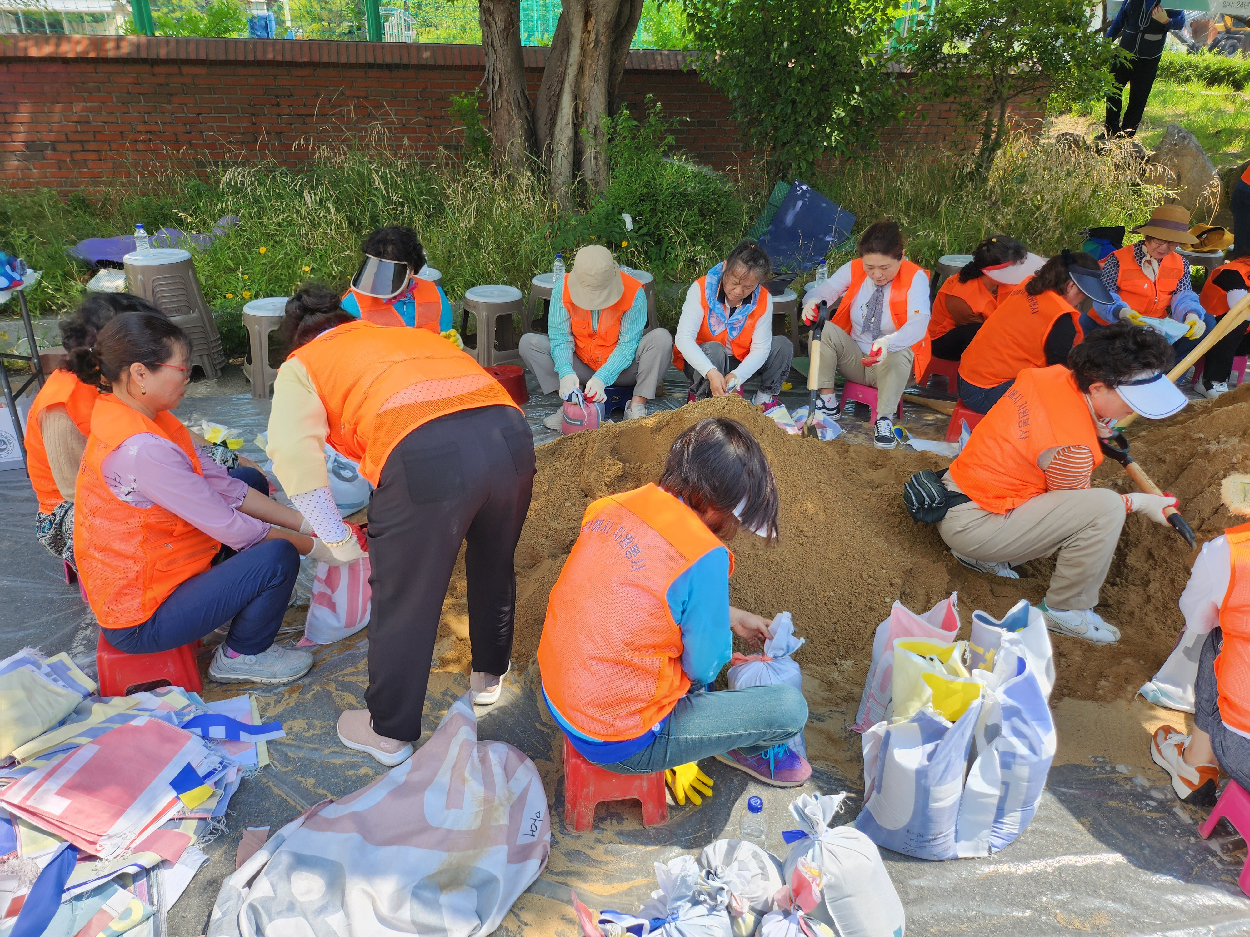 주말 동안 보슬비가 내린 후. 다소 햇빛이 강했던 6월 11일. 경상남도자원봉사센터와 김해시자원봉사센터가 함께 재난대비용 모래주머니를 만들었습니다.